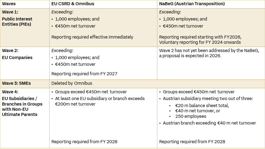 Wave 2, covering large undertakings not previously subject to similar reporting requirements, are not yet addressed by the NaBeG. The Austrian legislator has explicitly indicated that a new legislative package to cover this group is expected in the first half of 2026. Full compliance with the CSRD for these entities will therefore follow at a later stage. The upcoming legislation is expected to reflect the latest amendments introduced by Omnibus I.